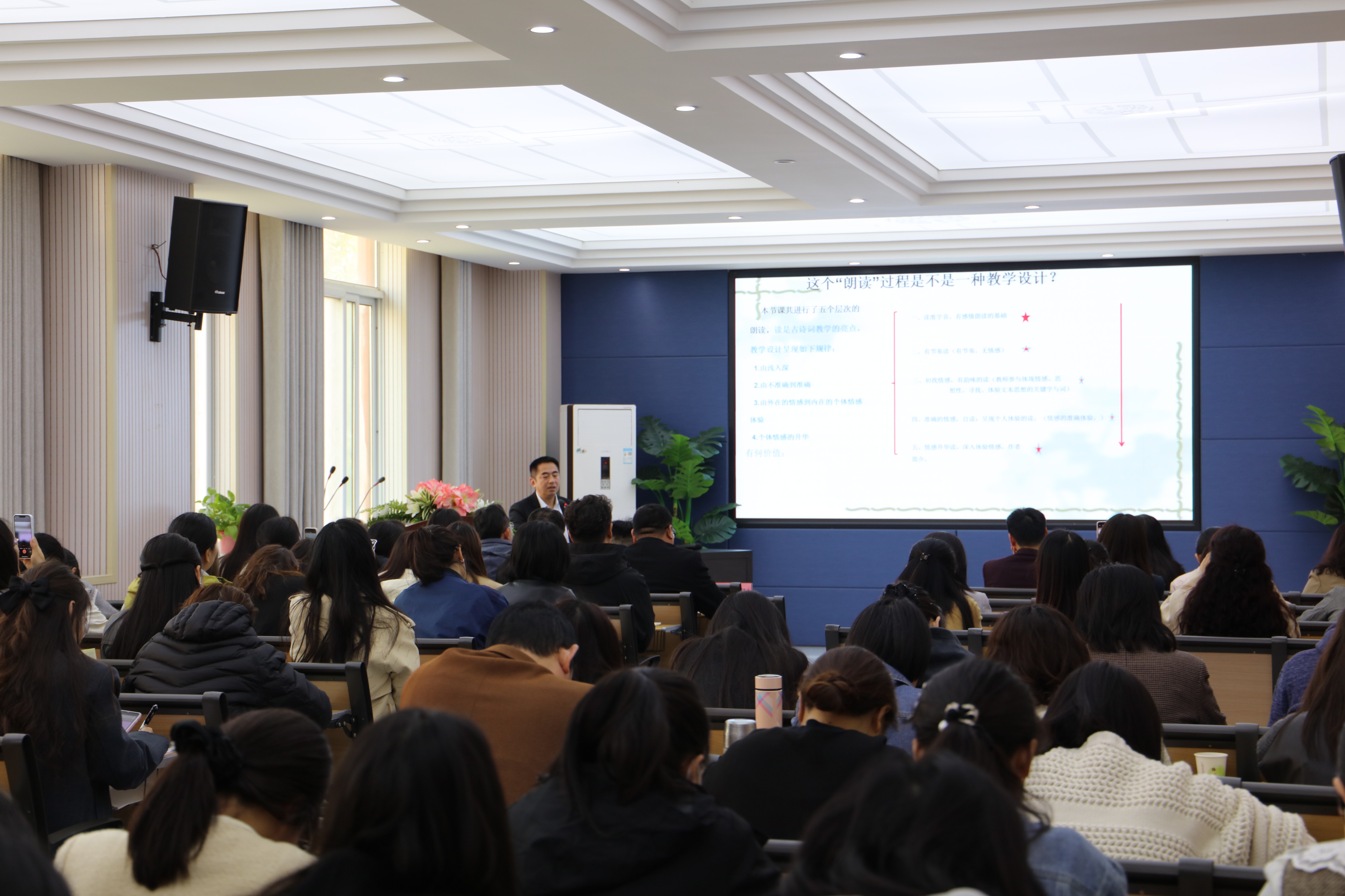 最后,河南师范大学教授、博士生导师、河南省中小学课堂教学研究中心主任魏宏聚作专题培训。魏宏聚以深入浅出的讲解,带领大家走进“显微镜下的课堂”,将复杂的教学结构设计拆解为可操作、可迁移的方法,让在场教师深刻理解了如何通过课堂教学切片诊断实现课堂教学质量的真正提升。魏宏聚的培训既有理论高度,又有实践深度,赢得了阵阵掌声。
