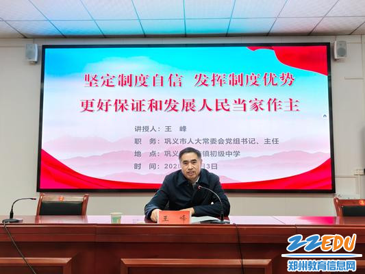12月3日上午,巩义市人大常委会党组书记、主任王峰到巩义市康店镇初级中学为师生上思政课。