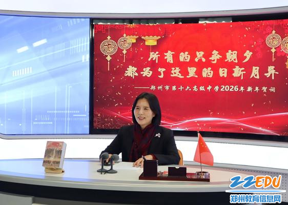 联欢会伊始,郑州市第十六高级中学校长王彦荣通过线上直播向全体师生致以新年祝福与感谢。她回顾了过去一年学校取得的丰硕成果:品牌建设上获评河南省特色高中、全国文明校园提名及多项国家级荣誉;育人成果方面,学校有了质的飞跃与长足的进步;在建校70周年之际,成功举办全国普通高中“理工联盟”特色发展暨河南省高中物理省级学科建设学术研讨活动。展望2026年,她提出将聚焦科技特色高中建设、深化教学法与课程体系、锻造高水平师资、构建家校共育桥梁,致力于将健康大道16号建成师生安心钻研的美好家园,呼吁师生携手奋进共创辉煌,最后祝愿全体师生新年快乐、平安健康、学业工作顺利!