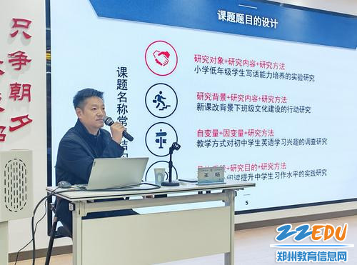 针对课题申报这一关键环节,王旸对立项申报书的撰写进行了“模块化”精讲。围绕“选题依据”“核心概念界定”“文献综述”“研究设计”等核心模块,他结合郑州市教育科学课题的评审标准与典型实例,深入剖析了各部分的撰写要领与常见误区。讲座内容不仅注重理论引导,更强调实践应用,实质上为与会教师呈现了一个结构清晰、要素完备的课题申报“核心技能包”,有效降低了科研入门的实操难度。