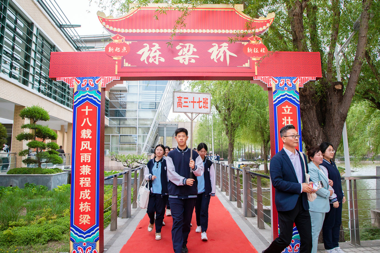 走出行健馆,踏上通往学校桃林广场的路。桥下流水潺潺,映照着同学们笃定的面庞,门楼巍然矗立,见证着青春的脚步从此跨越,一面巨大的签名墙静候着每一份成人的誓言。同学们郑重写下自己的名字——一笔一划,是对少年时代的郑重告别;一字一句,是对广阔人生的庄严宣誓。