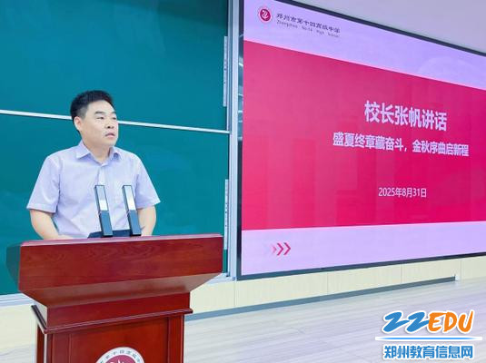 接着,郑州市第十四高级中学校长张帆作主题发言《盛夏终章藏奋斗 金秋序曲启新程》。通过复盘假期工作,张帆充分肯定了各部门在特色品牌创建、师资培训、后勤保障、德育实践等方面取得的成绩。同时,对学校本学期的工作计划作了进一步解读,提出要把握“党建领航”的“方向盘”,确保办学方向不偏航;要聚焦“育人核心”的“关键点”,实现学生全面成长;夯实“师资与服务”的“支撑点”,为办学质量保驾护航。最后,对开学工作作出部署,要求以学校新学期工作计划为指引,抓好教学准备、德育活动开展与行政保障工作,确保开学平稳有序,推动各项目标落地,将发展规划转化为实际成效。