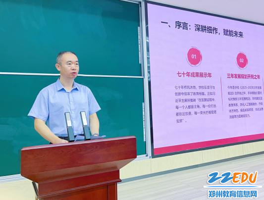 随后,郑州市第十四高级中学党委书记马海峰以《内强本领展形象 深耕细作赋能未来》为题对郑州市第十四高级中学2025-2026学年上期工作计划进行解读。他强调本学期要以党建为引领,推动党建与教育教学、德育、教师发展深度融合,筑牢办学根基;聚焦德育铸魂,构建“家—校—生”三位一体生涯教育体系,助力学生全面成长;落实人才兴校,通过各类赛事、培训,提升教师专业素养,打造优质师资团队;锚定质量立校,聚焦内涵提升、过程规范等精细化管理;以“人无我有、人有我优”为核心,打造特色品牌赋能高质量发展;守牢安全底线、优化校园服务,构建师生满意的和谐校园。