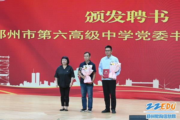 郑州市第六高级中学党委书记董慧蕴为和笑天、范阳阳两位劳模工匠颁发聘书