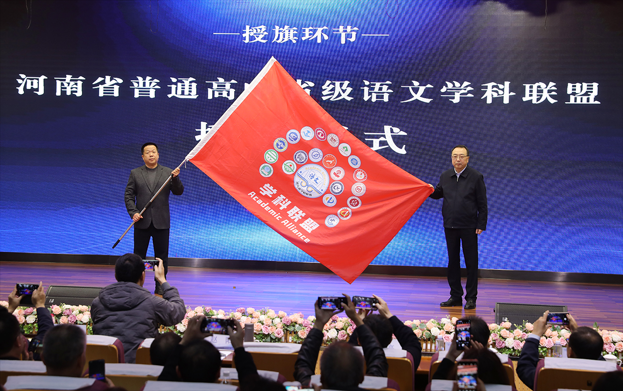 随后,河南省基础课程与教学发展中心党委书记、主任、河南省基础教育质量检测中心主任赵阳将象征初心、梦想与责任的联盟旗帜,郑重授予联盟理事长代表、郑州市第一〇一中学党委书记李国喜。旗帜舞动间,凝聚起全省高中语文教育同仁携手并进、共谱新篇的磅礴力量,标志着河南省普通高中省级语文学科联盟正式扬帆启航。