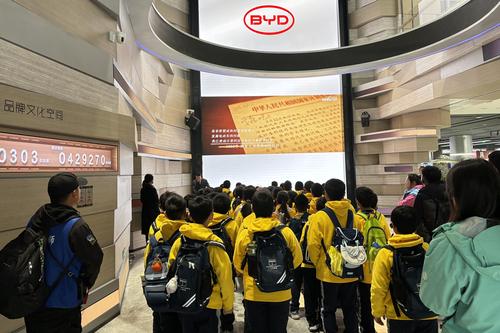 上午九点,在比亚迪郑州迪空间一楼展厅,教师们与在现场参观的小学生一起,通过时代的回信,学习以钱学森等老一辈科技工作者的无私奉献精神,了解未来科技领域的发展方向。在二楼展厅内,师生们一起探讨色彩呈现的奥秘,探寻光学原理,理解不同颜色在文化中的意义。在三楼展厅内,研学老师围绕智能车机等科技,为师生们展示了现今的科技成果,启发他们对未来科技的思考。