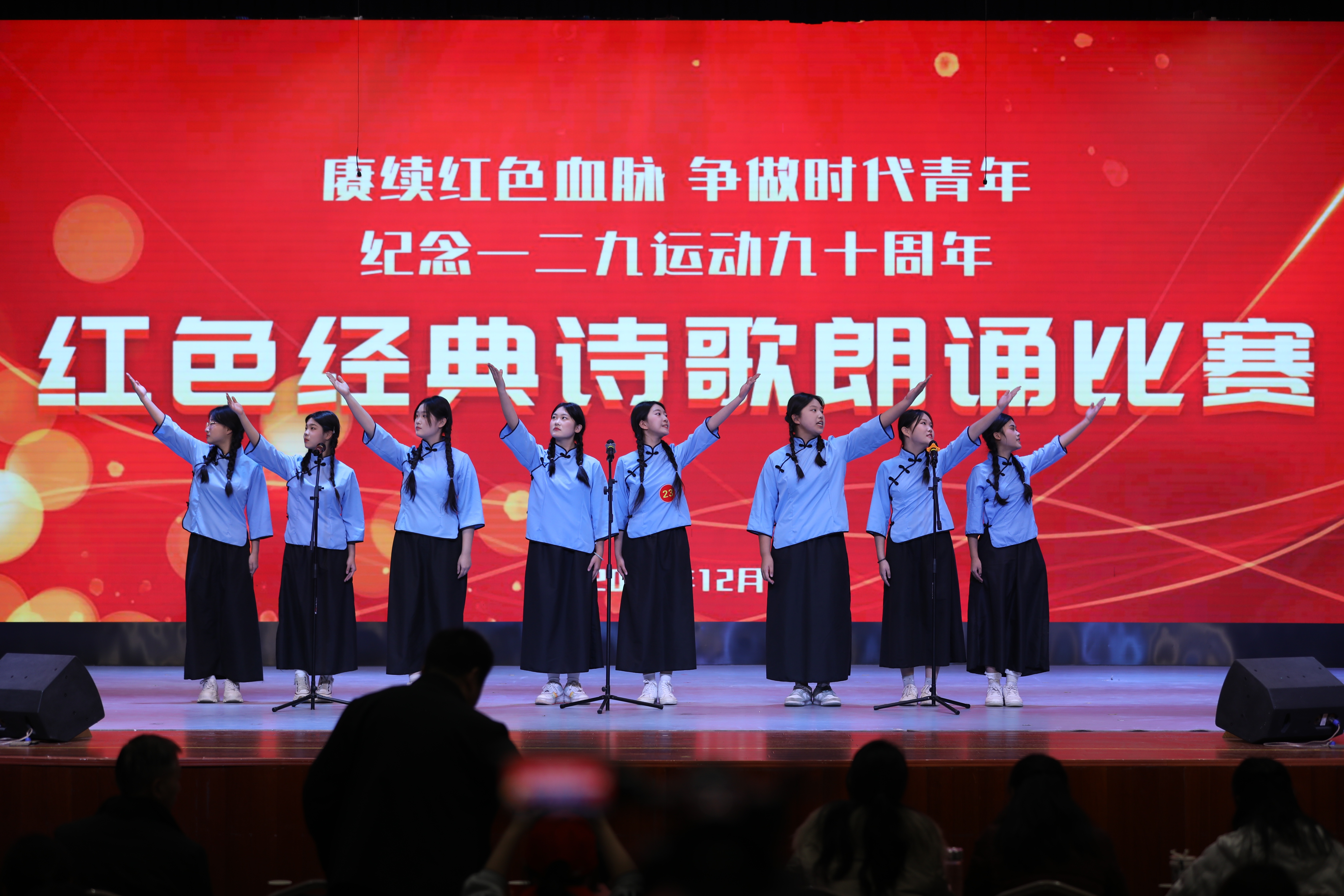 比赛现场气氛庄重而热烈,来自各年级的30组选手精神饱满、意气风发。《沁园春·长沙》的雄浑壮阔,《青春中国》的热血沸腾,《我爱这土地》的深沉眷恋,《我骄傲,我是中国人》的民族自豪……他们用昂扬的热情、真挚的情感、生动的肢体语言和富有感染力的声音,演绎了一首首脍炙人口的红色经典诗篇。选手们将个人情感与诗歌意境完美融合,生动再现了革命年代青年学子为国家命运呐喊抗争的光辉历史,抒发了新时代青年对祖国深沉的热爱和对未来美好的憧憬,带领现场观众重温了那段波澜壮阔的峥嵘岁月,深刻感受到了革命先辈们坚定的理想信念和无私的奉献精神。
