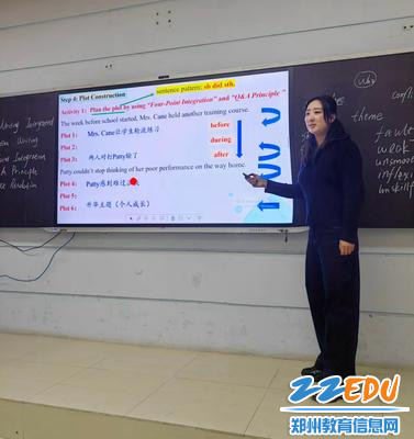 课堂伊始,李文瑾老师便以群文阅读为抓手,引导学生积累运动主题的优质表达,为后续写作实践筑牢素材根基。进入阅读环节,她创新性地以给定的两句话为切入点,带领学生逆向推导原文脉络,同时通过圈画关键信息,系统梳理并总结出 “人物(who)、时间/地点(when/where)、冲突(conflict)、主题(theme)” 四大核心要素。紧接着的情节构建环节,她以 “sb did sth.” 基础句型为核心支架,融合 “四点合围”、“QA 法则”、“矛盾解决法” 三大策略,帮助学生搭建起清晰且富有逻辑的写作框架。