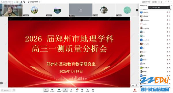 为精准把脉学情、深度对接2025年新修订课标要求,1月19日下午,郑州市基础教育教学研究室组织召开2026届郑州市高三地理学科第一次质量分析教研会。受雨雪天气影响,会议调整为线上形式,各区县(市)地理学科教研员、高中地理学科共同体负责人以及全体高中三年级地理教师云端相聚、如期参会。