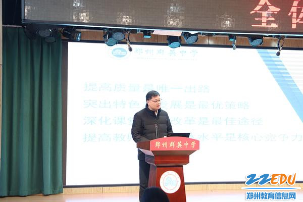 随后,郑州群英中学副校长成顺利以《凝心聚力谋发展 守正创新谱新篇》为题,从加强教育政策学习、坚持立德树人根本任务、打造高素质教师队伍、涵养高质量群英课堂等方面对新学期教育教学工作进行安排部署。他谈到,我们要坚守教育本真,优化育人路径,尊重学生的个性成长,保障学生的全面发展,书写新时代教育华章,为区域教育发展贡献群英力量。