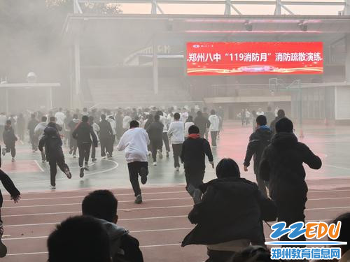 听到警报后,郑州八中七年级各班级学生在班主任及任课教师的引导下,立刻放下手中物品,双手捂住口鼻,身体弯腰低姿,沿着教学楼两侧的疏散楼梯快速有序撤离。过程中,学生们严格遵循“靠右行走、不推不挤、不慌不乱”的原则,即使在烟雾较浓的区域,也保持冷静,紧跟队伍步伐。从警报响起至最后一名学生到达操场指定集合点,整个疏散过程仅用时5分20秒,充分展现了前期安全教育的扎实成效。