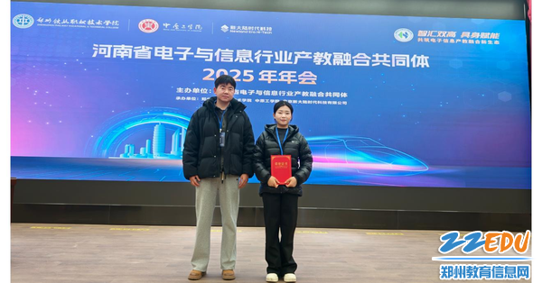 在河南省电子与信息行业产教融合共同体增补仪式上,郑州市科技工业学校代表上台接受为共同体副理事长单位颁发的证书,标志着郑州市科技工业学校正式融入河南省电子信息行业产教融合生态圈,未来将在人才培养、课程共建、师资共享、实习就业等方面与行业企业开展深度合作。